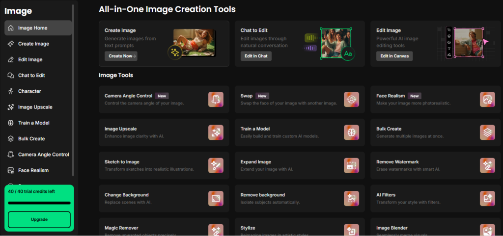 Just type what you imagine — like “futuristic city skyline at sunset” — and OpenArt generates a beautiful image for you. You can customize styles, colors, and artistic effects.